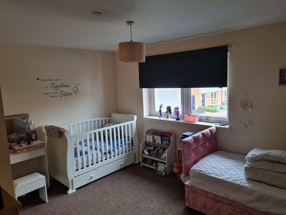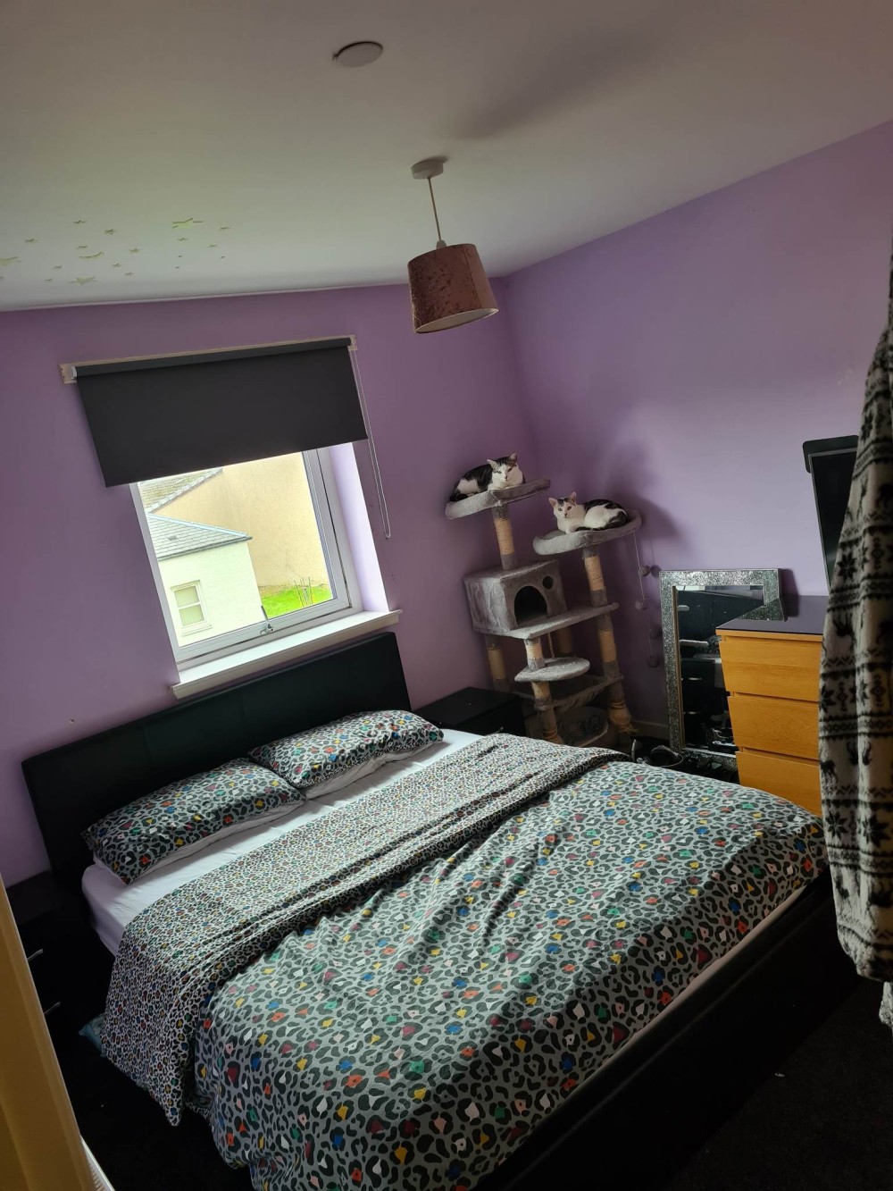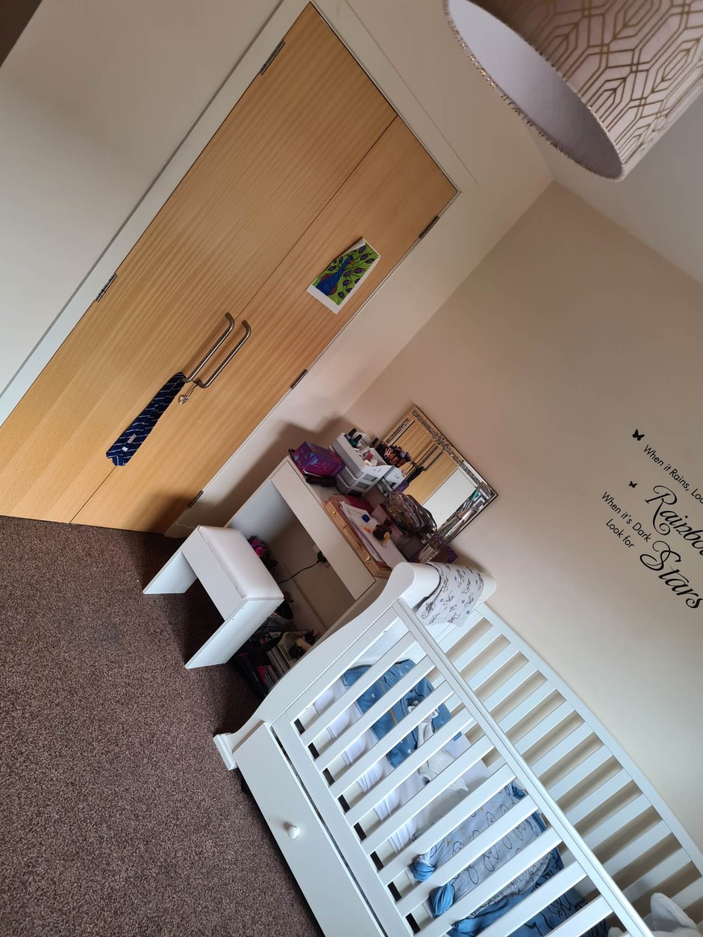 *6 year old house* Bedroom 1: very big with 2 built in wardrobes- 1 of them walk in, Bedroom 2: good size with 1 built in wardrobe, bathroom upstairs and downstairs toilet with sink. Very large kitchen with big storage cupboard and big private back garden all fenced off. Parking outside livingroom window.