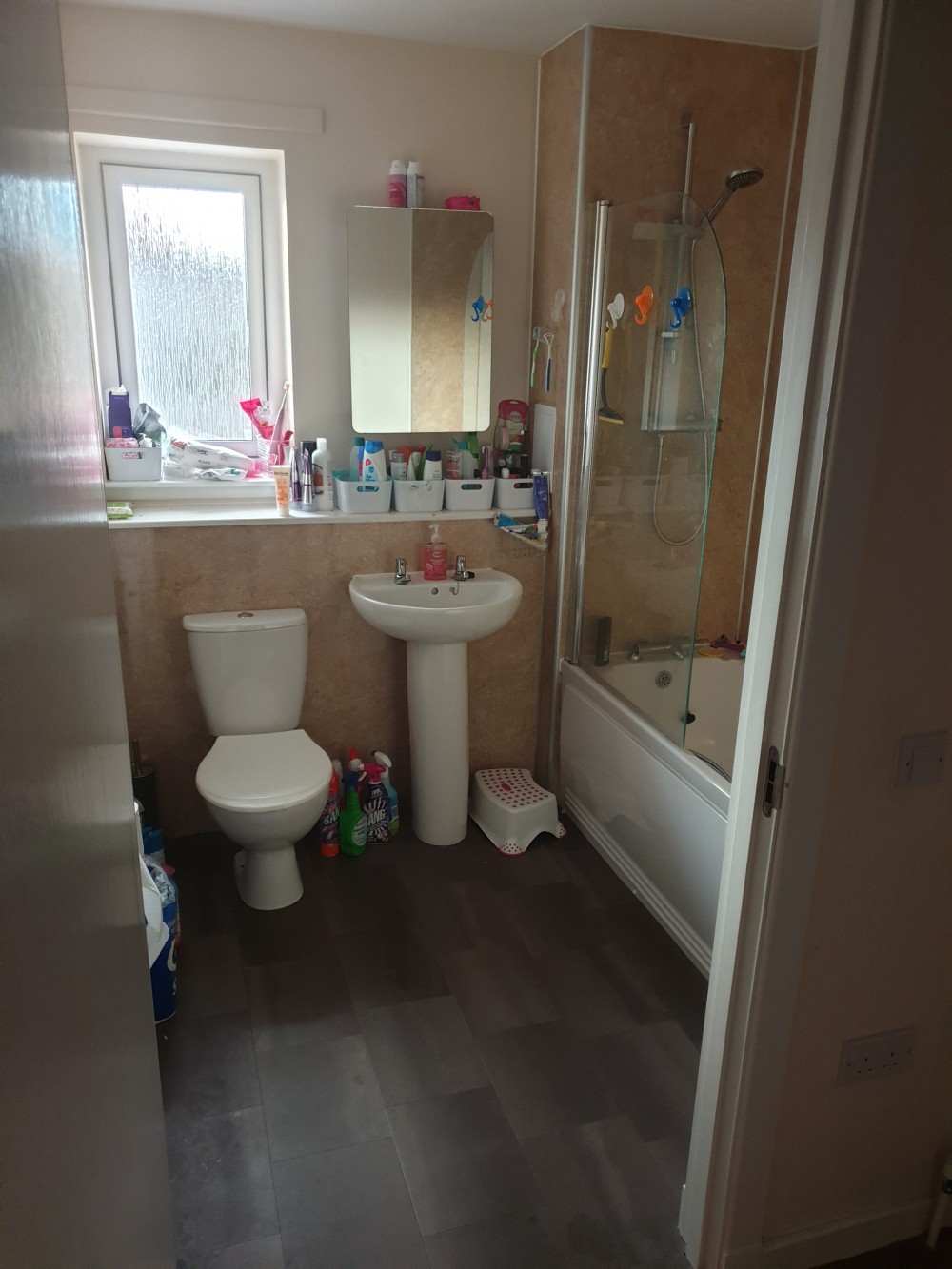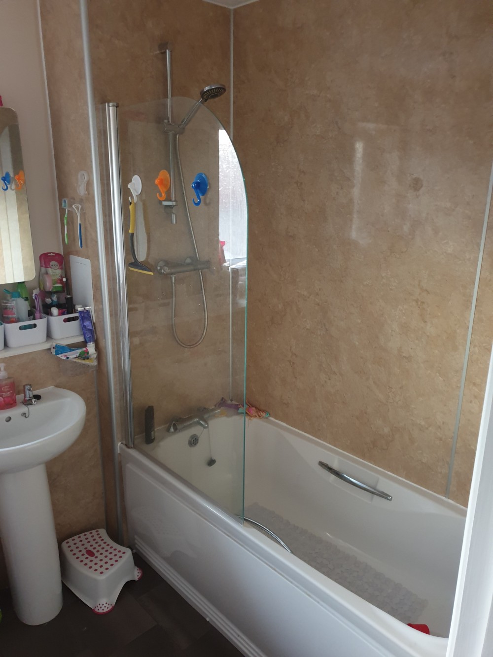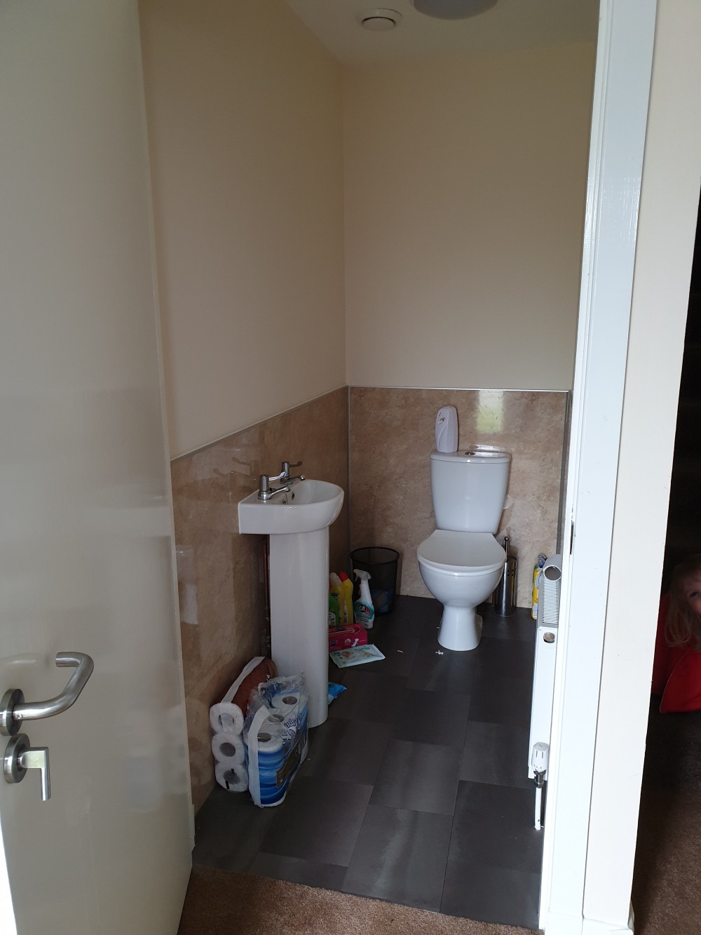 With loo amd hand sink. With air conditioning. Still Magnolia from when i moved in and wet wall fitted