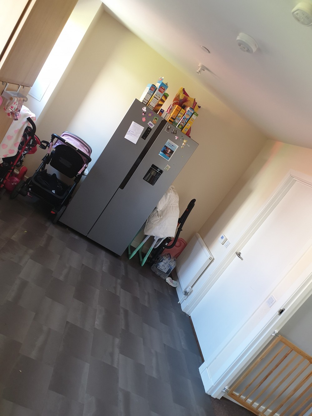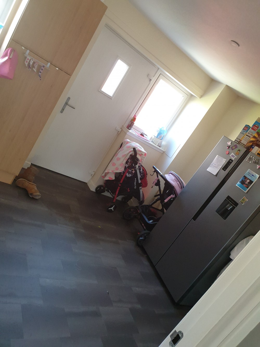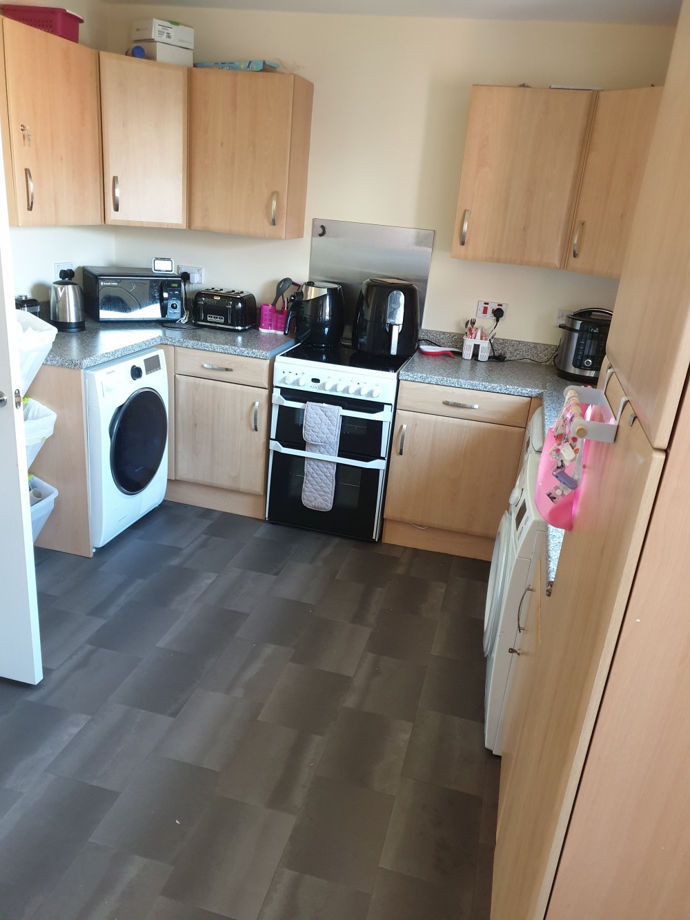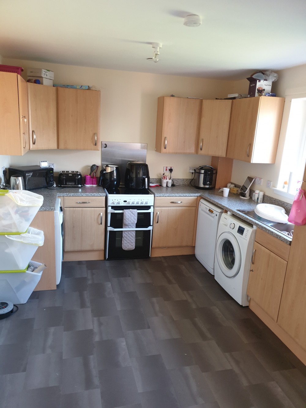 Has a place for a dishwasher, tumble dryer, washing machine, cooker and a tall standing fridge freezer. I had to do away with my table due having an american fridge freezer. With triple glazing and thick insulation and sprinkler fitted and air conditioning. Has a walk in cupboard for storage. Access out to the back garden. Combi boiler. Plenty fitted cupboards. Its in the process of being decorated just now since the picture was took of it.