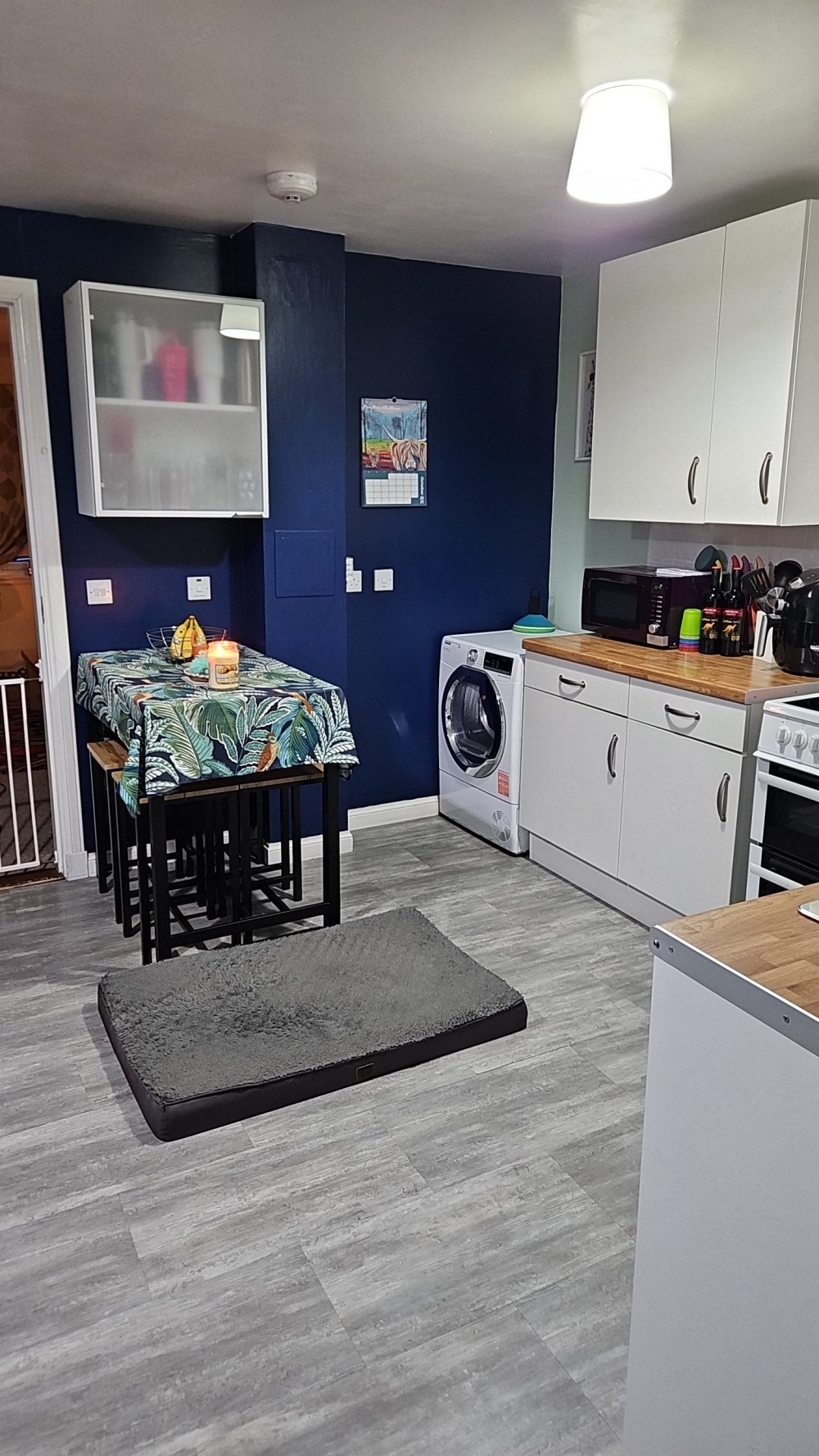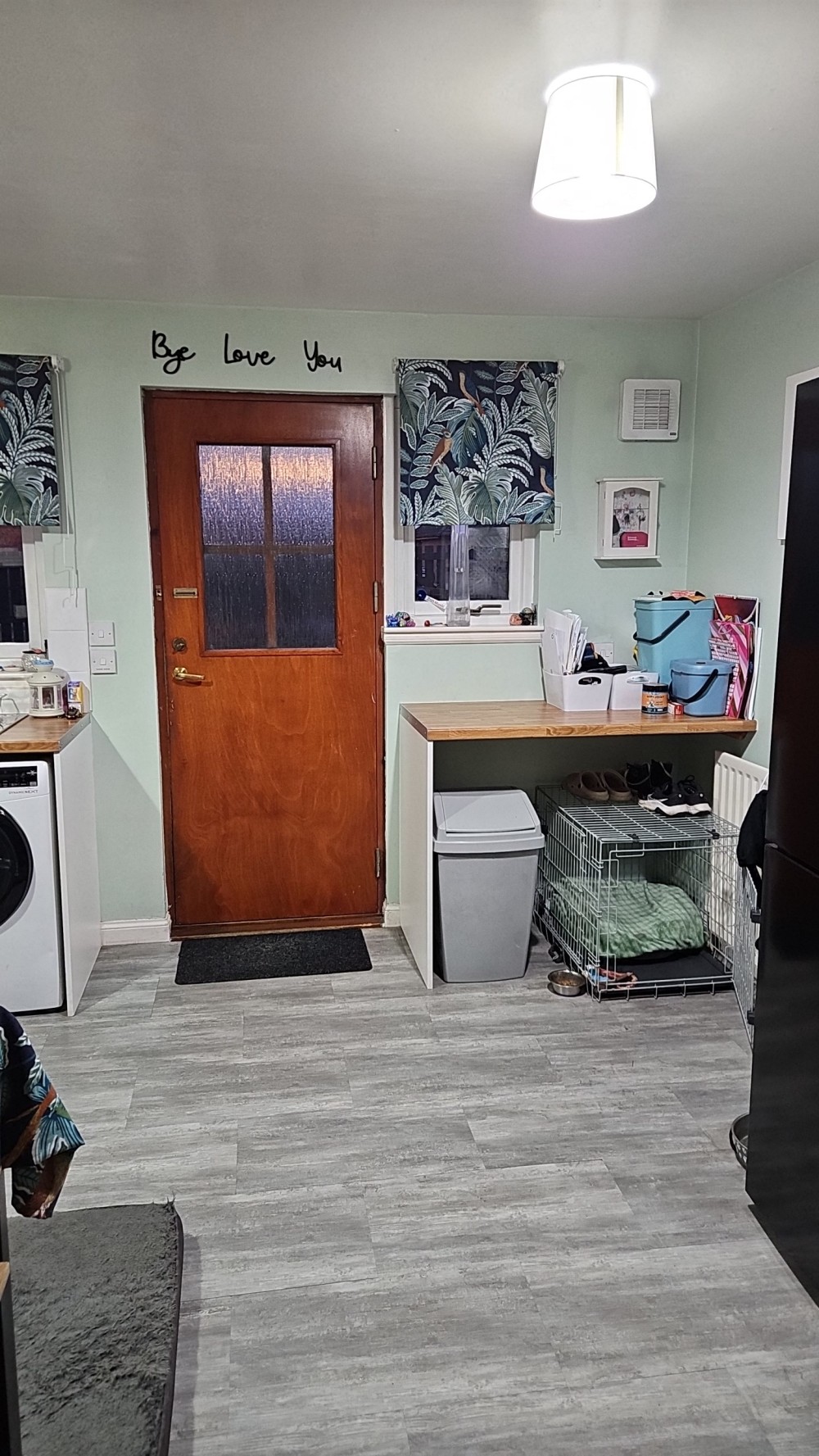 Large kitchen newly fitted in 1.5 years ago with plenty of floor space and large storage cupboard.