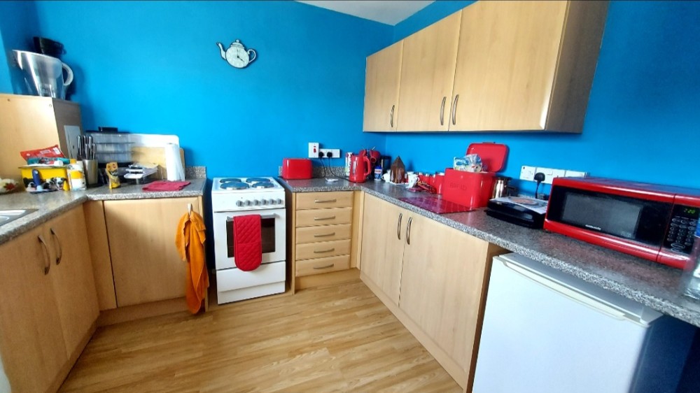 â—‹ Straight on from the front door is a mid-sized, square living room, the back corner of which connects to a small kitchen complete with oven, and separate fridge and freezer space.